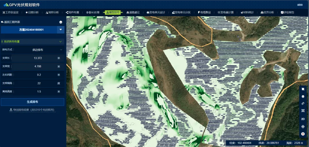 排布方式①采用常规排布,保证容量的前提下,将光伏阵列左边对齐布置,方便后续的电气设备和电缆布置。共布置4629个光伏阵列,即111096个光伏组件,项目装机容量为61.1028MWp,如图所示: