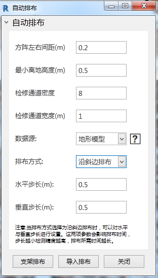 点击“发电单元”下的“组件布置”,“组件选型”选择工程使用组件,选择后会自动读取组件尺寸。输入本项目“单串组件数量”,“组件倾角”。输入“组件南北、东西间距”,布置串数,组件行数,布置方向选择“纵向”,单击“保存”。