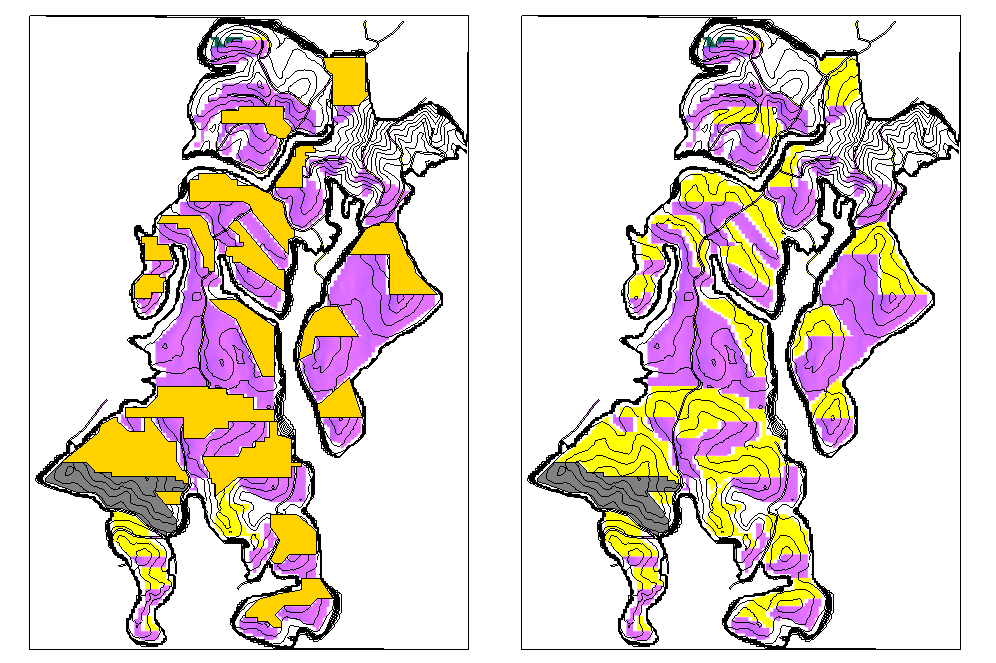通过影长计算结果进行影长整合,最小单元面积为1000㎡,点击“计算”按钮,将整合计算提交进行计算,计算完成后,点击“查看”,可以查看影长整合过后的图示。影长整合可以多方案进行对比,让项目的土地利用效率最高。