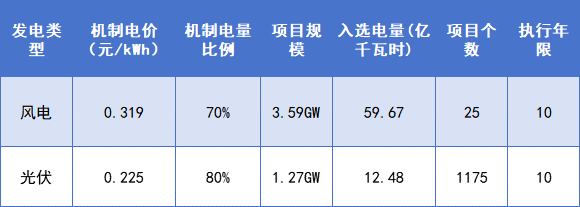 风电机制电价为0.319元/kWh,机制电量比例为70%,入选电量为59.67亿千瓦时。